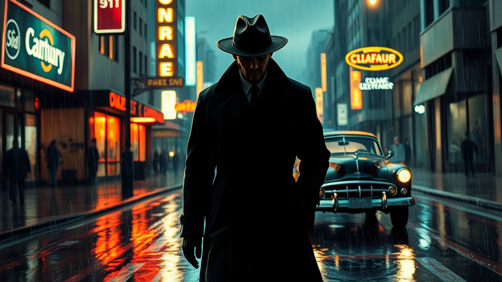 A man in a trench coat and hat walks down a rain-slicked street, a vintage car trailing behind him. The scene exudes a noir atmosphere with cyberpunk influences, characterized by stark neon lighting and shadowy silhouettes. The artwork pays homage to Ben Templesmith's neo-figurative style, capturing a gritty, oversaturated aesthetic. The man's expression is obscured by shadow, adding an enigmatic allure. Raindrops blur into the background, enhancing the sense of motion, while the car's headlights create a halo effect around the figure. The street is lined with flickering, glitchy signs in a dissonant urban landscape, adding to the surreal quality. The figure's silhouette is slightly elongated, with a hint of distortion that evokes a dreamlike quality, drawing viewers into this mysterious, rain-drenched world.
