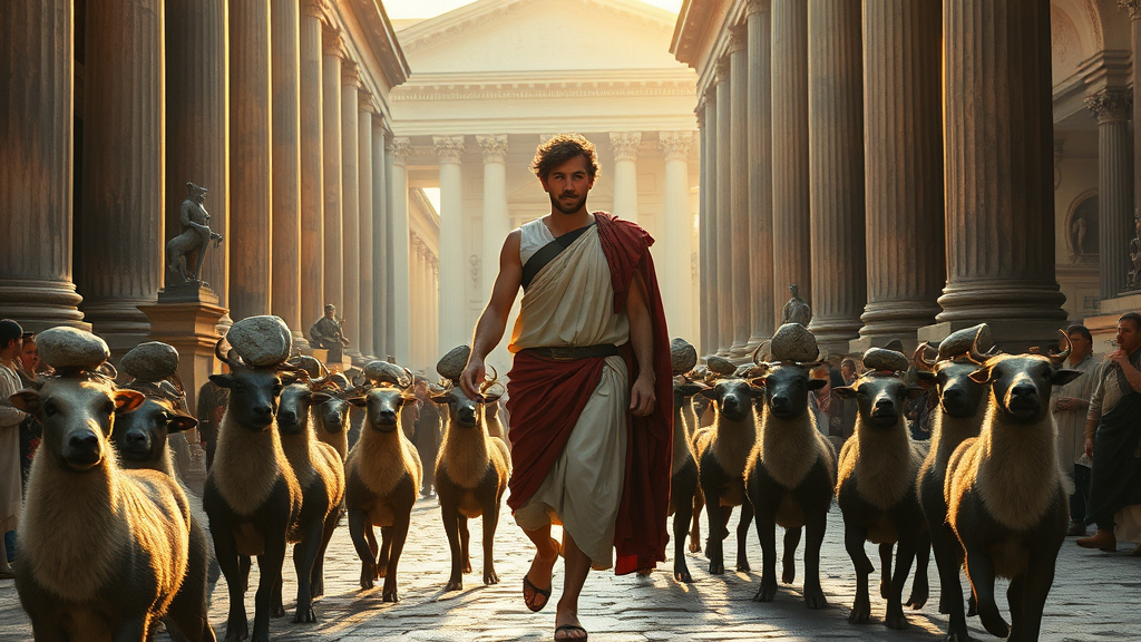 A man in ancient Roman attire strides purposefully through the bustling streets of Rome, surrounded by a mesmerizing procession of animals, each carrying stones that levitate to form a mystical circle around him. The scene is bathed in dramatic, cinematic lighting that casts long shadows and highlights the intricate details of the environment, from the finely carved Roman statues to the grand, towering architecture. Golden sunlight filters through the columns, illuminating the fine textures of the man's toga and the gleaming fur of the animals, creating a vivid tableau. The streets are alive with the hustle and bustle of Roman citizens, their expressions captured in high detail, enhancing the immersive realism of the scene. The overall composition is one of high resolution and sharp focus, emphasizing the super detailed artistry reminiscent of Greg Rutkowski's style, capturing a moment that feels both epic and intimate in its raw, stylized execution.