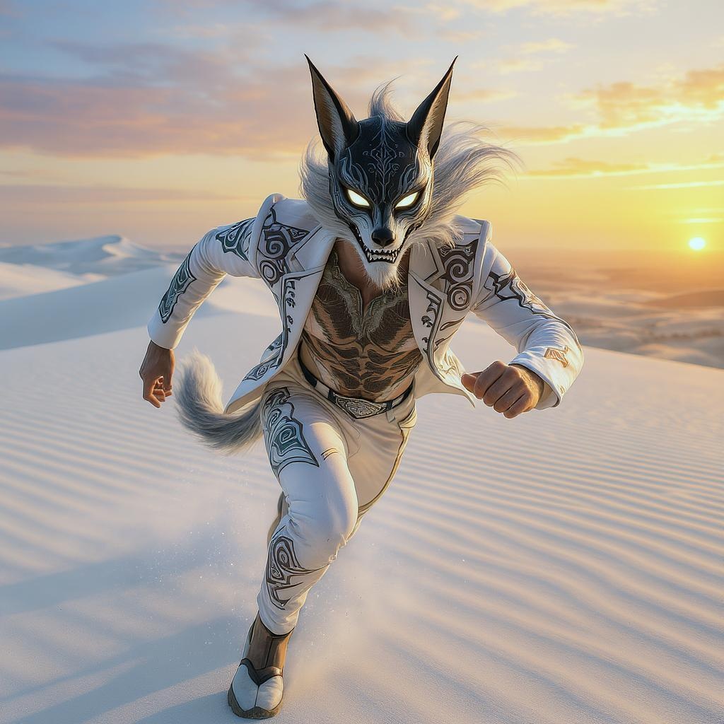 A man is captured in a strikingly dynamic pose as he dashes across the pristine expanse of a white sand desert. His eyes lock onto the camera through the mystical slits of a kitsune mask, a nod to Japanese folklore. His attire combines traditional elements with a futuristic twist—a sleek white suit adorned with elaborate tribal designs. The ensemble echoes the mystical allure of the kitsune, with flowing lines and patterns evoking the fluidity of a spirit in motion. His face is painted white, enhancing the ethereal vibe, while the setting sun casts a radiant glow, infusing the scene with vivid, dream-like colors and an overwhelming sense of awe. The expansive dunes ripple softly in the background, adding to the otherworldly atmosphere of this captivating moment.