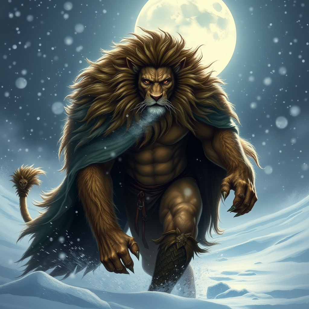 A man-lion hybrid strides through a fierce blizzard on a moonlit winter night, his powerful frame draped in luxurious furs that ripple in the icy wind. His mane, a wild cascade of hair blending seamlessly with his human features, glows faintly under the silver glow of the moon. Each breath produces a cloud of mist, mingling with the snowflakes that dance around him. His eyes, piercing and feral, scan the frozen landscape with a watchful intensity. The compact muscles beneath his furred cloak ripple with strength, embodying a majestic yet fearsome presence. This fantastical creature, reminiscent of Greg Rutkowski's spellbinding illustrations, brings forth an aura of ancient magic and raw, untamed power.
