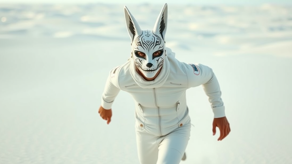 A man runs energetically across a vast expanse of white sand dunes, his eyes fixed intently on the camera. He wears a vibrant kitsune mask, his face adorned with white paint and intricate tribal patterns that trace the contours of his visage. His attire, a sleek white suit, fuses traditional kitsune elements with a futuristic speed racer flair. The soft, dreamy ambiance of the white sand desert amplifies the scene, bathing it in bright, surreal colors, evoking a sense of awe and wonder in this striking tableau.