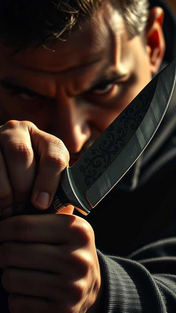 A man, skilled in the art of assassination, wielding a finely crafted knife with intricate engravings, captured in a cinematic style inspired by Rutkowski. The scene is enriched with a dynamic depth of field, reminiscent of a masterful Lightroom edit, casting dramatic shadows and highlights that emphasize his focus and precision.