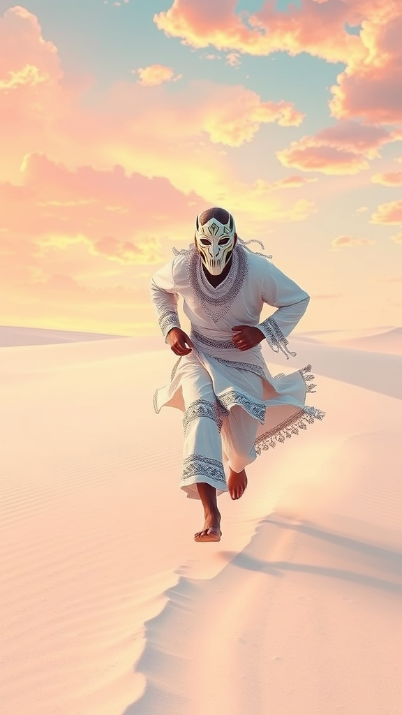 A man sprinting across a luminous white sandy dune, his eyes fixed on the camera, adorned with a mystical white tribal mask and voluminous white garments with elaborate tribal patterns. The scene is infused with a dreamlike quality, bursting with vibrant and ethereal colors. The setting feels futuristic, with an anime-inspired style reminiscent of Studio Ghibli's magical worlds. The sky is a cascade of pastel hues, casting a surreal and enchanting glow over the entire scene.