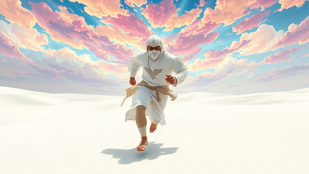 A man sprinting across a vast expanse of pristine white sand dunes, his gaze fixed intently on the camera, his face obscured by a mystical, white tribal mask adorned with delicate patterns. He is clad in flowing, oversized garments of pure white that flutter dramatically with each movement, intricately detailed with tribal symbols. The scene is infused with a dreamlike quality, bursting with vibrant, kaleidoscopic colors that paint the sky in a mesmerizing dance. The atmosphere is ethereal and imaginative, blending elements of a futuristic landscape with anime-inspired aesthetics, reminiscent of a Studio Ghibli film, capturing an otherworldly blend of tradition and innovation.