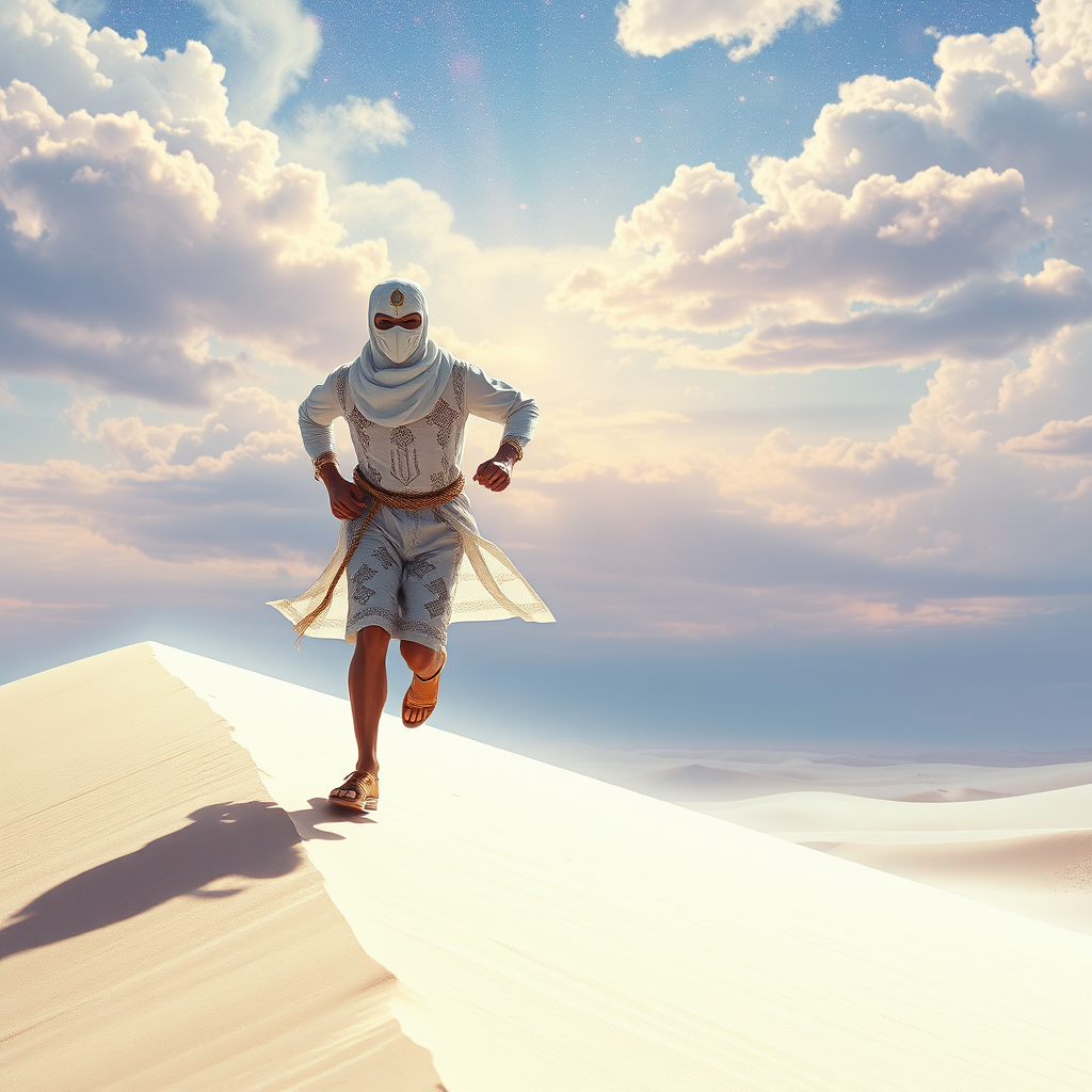 A man sprinting across the peak of a luminous dune, his gaze fixed on the camera, donned in a mystical white tribal mask and flowing oversized garments, adorned with delicate tribal patterns. The scene is dreamlike, brimming with vivid, surreal colors, a fusion of futuristic elements and anime flair reminiscent of studio ghibli. The sky above shimmers with iridescent hues, casting an ethereal glow on the vast expanse of pristine sand.
