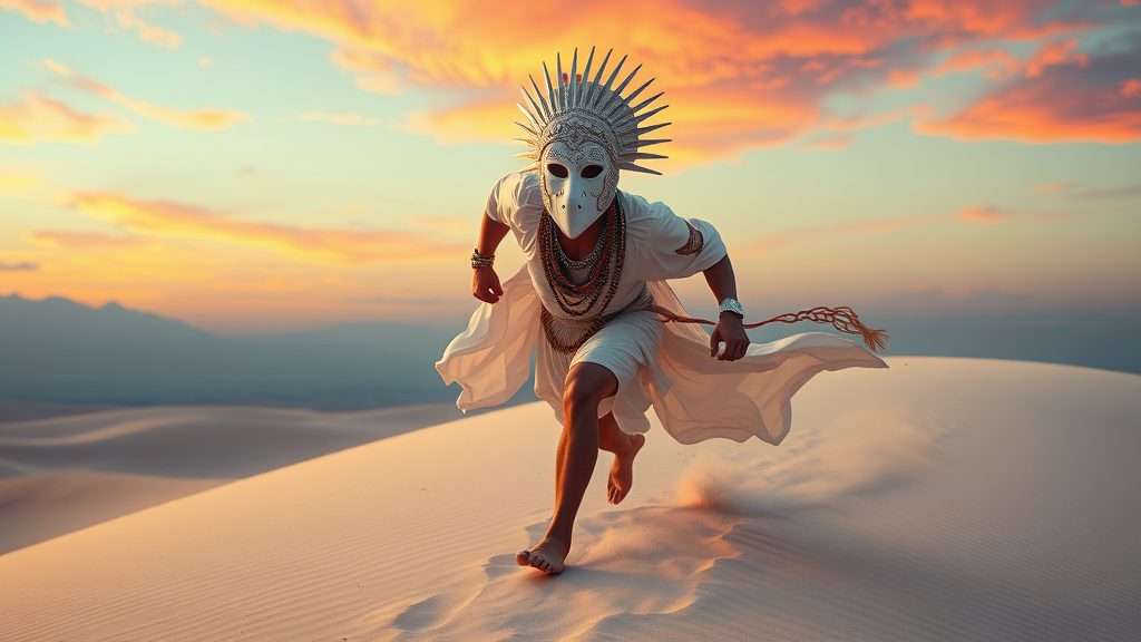 A man sprinting across the peak of a white sandy dune, gazing directly into the lens with a striking white tribal mask adorning his face. He is clad in flowing, oversized white garments embellished with intricate tribal patterns. The scene exudes a dreamy, ethereal quality, bursting with vibrant, kaleidoscopic colors. The style blends futuristic and anime influences, echoing the whimsical yet profound essence of a Studio Ghibli creation. The sky is awash with hues of twilight, casting a magical glow, and subtle winds stir the sands around him, accentuating his dynamic movement.