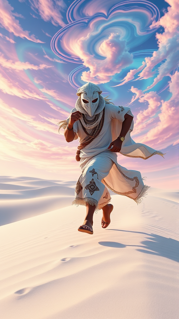 A man sprinting with intensity, gazing directly at the camera while atop a vast white sandy dune, adorned in a white tribal mask and flowing oversized garments. The outfit is embellished with intricate tribal patterns. The scene is dreamy and bathed in vivid, bright colors, merging futuristic elements with an anime aesthetic reminiscent of Studio Ghibli's artistic style. The sky above glows with an array of iridescent hues, imbuing the landscape with a fantastical aura as swirling clouds reflect the vibrant spectrum. The man's movement appears almost ethereal, as if he's part of a grand, otherworldly narrative.
