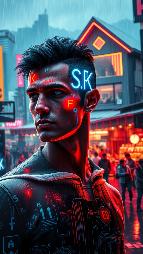 A man standing amidst a vibrant cyberpunk cityscape, his features interwoven with glowing SPK characters and symbols, reflecting off his skin like digital tattoos. Neon-lit letters dance around him in the air, hinting at secrets of the future. Rain falls softly, creating a shimmering layer of water on the bustling streets. In the background, a futuristic house stands with angular, neon accents, overlooking a bustling market filled with vendors and passersby. The scene is alive with the hum of technology and the whispers of a world driven by innovation.