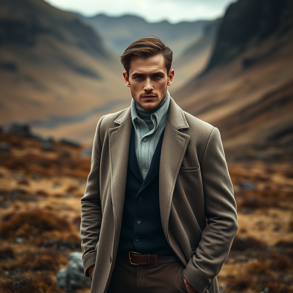 A man stands amidst a rugged Scottish landscape, clad in attire that catches the eye, reminiscent of Daria Endresen’s aesthetic. His outfit blends hues of light navy and dark brown, exuding an elegant yet mysterious vibe akin to Kris Knight's artwork. The scene captures the essence of Georg Jensen’s sophistication, with a focus on intense close-ups that reveal minute details of his expression. The matte finish of the photograph enhances the depth and texture, drawing attention to the interplay of shadows and light across his features, all set against the wild beauty of the highlands.