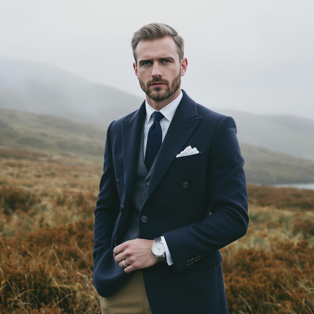 A man stands in the field, his attire meticulously curated for the camera, evoking the ethereal style of Daria Endresen and Kris Knight. The backdrop is a misty Scottish landscape, where hues of light navy and deep brown seamlessly blend with the scenery. He is adorned with elegant accessories reminiscent of Georg Jensen's craftsmanship, adding a touch of refined sophistication. The scene is captured in an intense close-up, with a focus on the play of textures and emotions. The photograph has a matte finish, amplifying the dreamy atmosphere of the portrait.