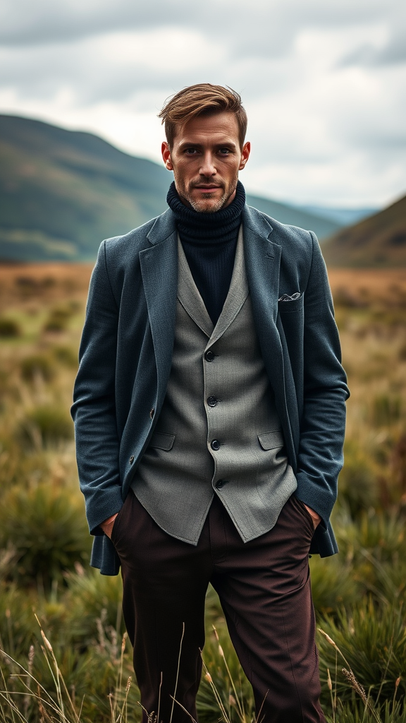 A man stands in the field wearing attire suited for the camera, capturing the essence of Daria Endresen's distinctive style and Kris Knight's unique flair, set against the backdrop of lush Scottish landscapes. His outfit blends shades of light navy and dark brown, reminiscent of Georg Jensen's sophisticated designs. The scene features intense close-ups, with a matte finish photograph rendering every detail vivid and lifelike. The composition is a harmonious balance of nature and fashion, an evocative portrait of rugged elegance.