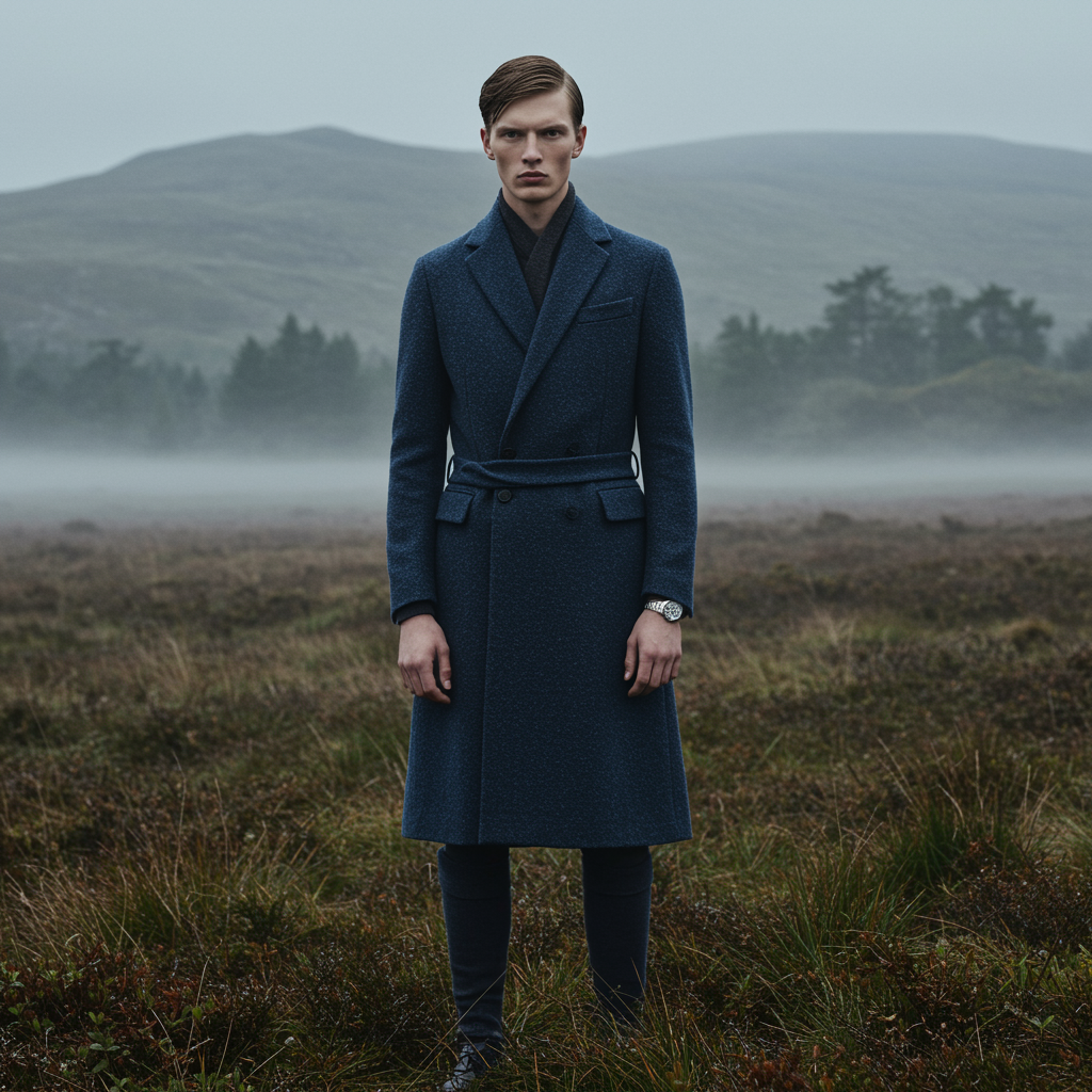 A man stands poised in a lush Scottish field, adorned in attire that reflects the essence of Daria Endresen's ethereal style, blended with Kris Knight's atmospheric touches. His clothes weave together shades of light navy and rich dark brown, echoing the subtle elegance of Georg Jensen's design. The scene is captured with an intense close-up, revealing intricate details in a matte finish, set against the backdrop of mist-laden Scottish landscapes.