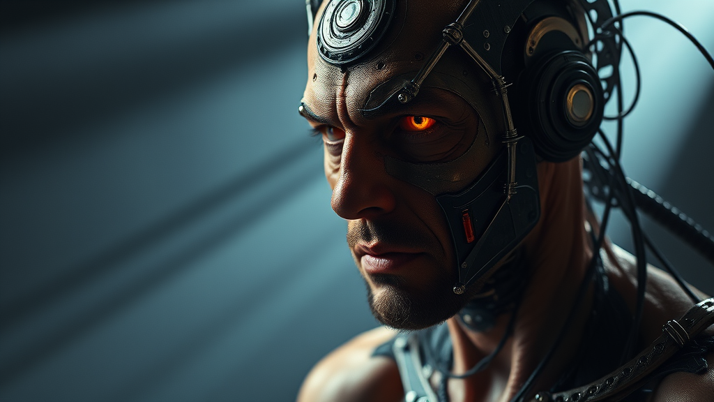 A man undergoing a dark transformation into a malevolent automaton, captured in breathtaking detail, 4k resolution, illuminated by ethereal light that casts long and haunting shadows, inspired by the visionary art of Peter Mohrbacher, with intricate mechanical elements intertwining with human flesh, conveying a sense of inevitable metamorphosis while his eyes glint with an eerie, mechanical glow.