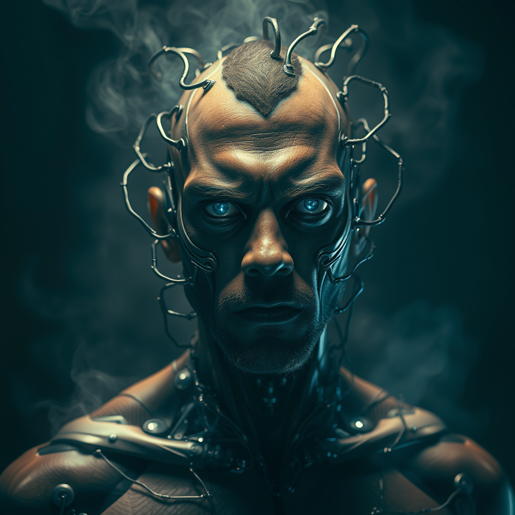 A man undergoing a transformation into a dark and ominous robot, captured in stunning 4k resolution, with ethereal lighting casting an otherworldly glow. The scene reflects the artistic style of Peter Mohrbacher, featuring intricate mechanical details merging with the man's human form. The atmosphere is charged with a sense of foreboding, as metallic tendrils weave through his skin, and his eyes glimmer with an unsettling, cold light. The background is an abstract blend of shadows and ethereal hues, emphasizing the dramatic change and hinting at the mysterious power of his new robotic identity.