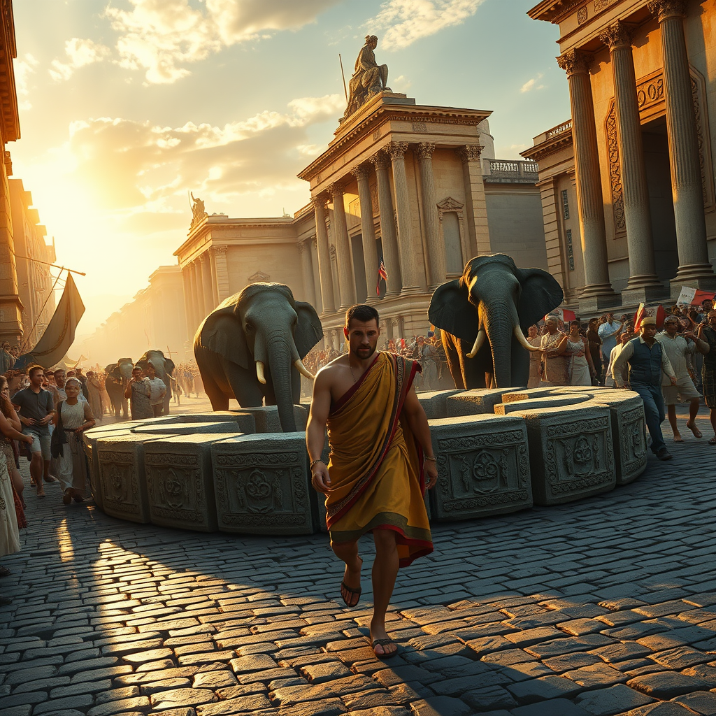 A man walks through the bustling streets of ancient Rome, surrounded by the hustle of daily life. Animals, including elephants and oxen, work alongside him, hauling massive stones to form a circle. The scene is richly detailed, capturing the essence of Roman architecture with towering columns and magnificent statues standing majestically in the background. The vibrant atmosphere is enhanced by cinematic lighting that bathes the city in a golden glow, casting elongated shadows across the cobblestones. Artistic flourishes bring the scene to life with intricate details, from the folds of the man's toga to the ornate carvings on the stone blocks. This breathtaking concept art is executed in a style reminiscent of Greg Rutkowski, with sharp focus, ultra-high resolution, and an emphasis on realism, creating a vivid snapshot of history in motion, seen through elements of dynamic lighting and meticulously rendered textures.