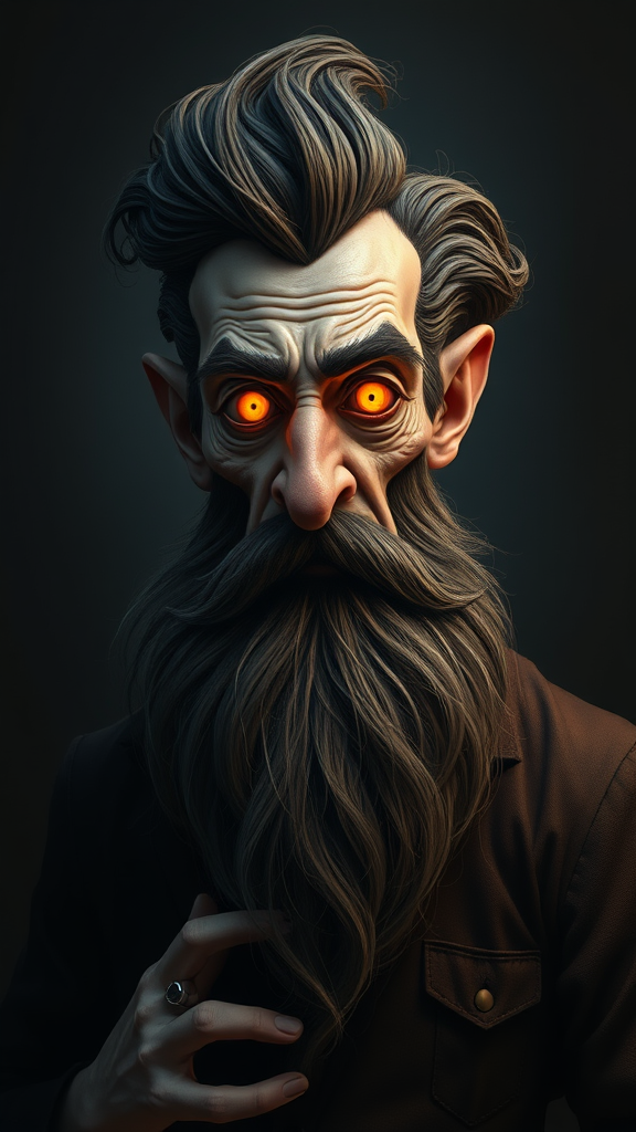 A man with a prominent, intricately styled beard and glowing, enigmatic eyes stands in a dimly lit room with a shadowy, black background. The digital portrait is inspired by Cedric Peyravernay’s DnD character art style, capturing a unique character with a hint of surrealism. This disfigured yet mystifying figure exudes an unusual charm despite distorted features and exaggerated proportions. The artwork is an amalgamation of kitsch aesthetics and low-resolution elements, combining elongated limbs, oddly shaped fingers, and a slightly twisted, elongated neck. The image exudes a sense of strangeness with oversaturated colors and grainy textures, reminiscent of dreamlike or eerie qualities. His face appears abstract and deformed, conveying complex emotion through its surreal composition.