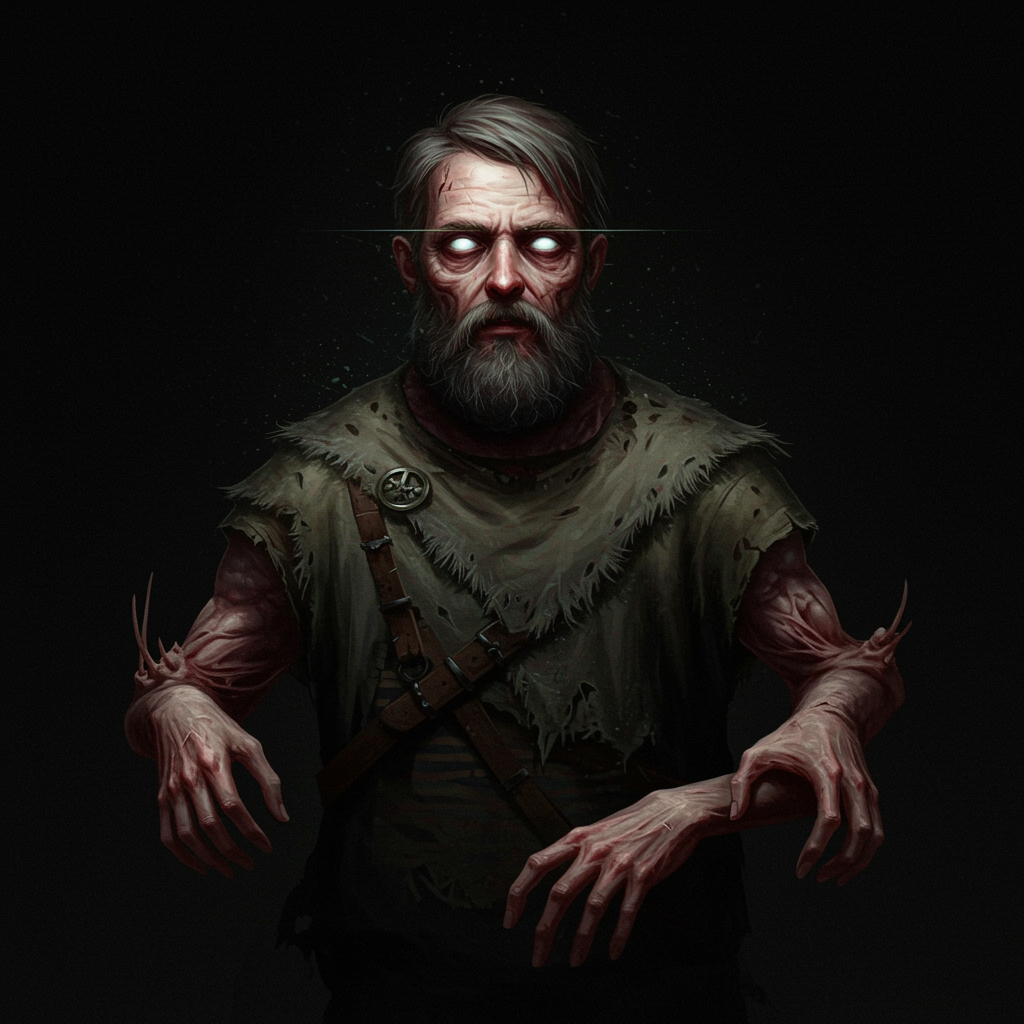 A man with a rugged beard and glowing eyes in a dimly lit room against an entirely dark background, inspired by Cedric Peyravernay's D&D character art. The digital portrait presents an intriguing mix of surreal and disfigured features, maintaining a sense of mystery. His face, while striking, hints at an aura of distortion with oddly proportioned features. The image is layered with grain and oversaturation, creating a surreal, low-resolution feeling. Some of his limbs appear subtly disconnected and malformed, with elongated fingers adding to the oddity. The overall portrait is both abstract and strangely captivating, drawing the viewer into its enigmatic, shadowy world.