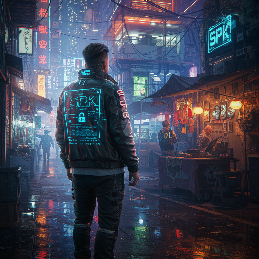 A man with SPK cyberpunk style characters and letters tattooed on his skin stands in a vibrant neon-lit alley. His jacket flickers with holographic displays and encrypted messages. Nearby, a bustling street market teems with vendors selling futuristic tech and exotic goods. The reflection of colorful city lights dances on the surface of rain-soaked pavements. Behind him, a towering structure merges elements of both a sleek modern house and an intricate network of pipes and wires, epitomizing the fusion of nature and technology.
