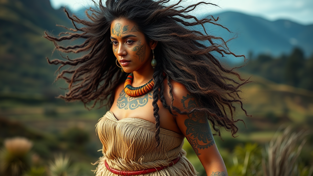 A Maori woman from New Zealand, her face adorned with intricate moko kauae tattoos that tell the rich history of her ancestors. Her hair cascades in a voluminous, wild mane, embodying both freedom and natural elegance. She wears a traditional, expertly woven flax skirt that gently sways with her movements, echoing the whispers of her heritage. The scene captures her poised strength and connection to her cultural roots, set against the lush, vibrant backdrop of New Zealand's diverse landscape, invoking a sense of pride and continuity.