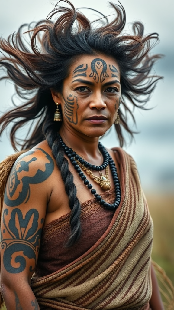A Maori woman in New Zealand stands proudly, her face beautifully adorned with intricate moko tattoos that weave a rich narrative of her ancestry and cultural heritage. Her hair flows in a wild, voluminous style, echoing the strength and spirit of her warrior ancestors. She is dressed in a traditional korowai, a woven flax garment that sways gracefully with her movements, its texture and patterns reflecting the natural landscapes of her homeland. In her eyes, there is a deep connection to the stories of her people, and her presence is both commanding and serene, embodying the timeless wisdom and resilience of her tribe.