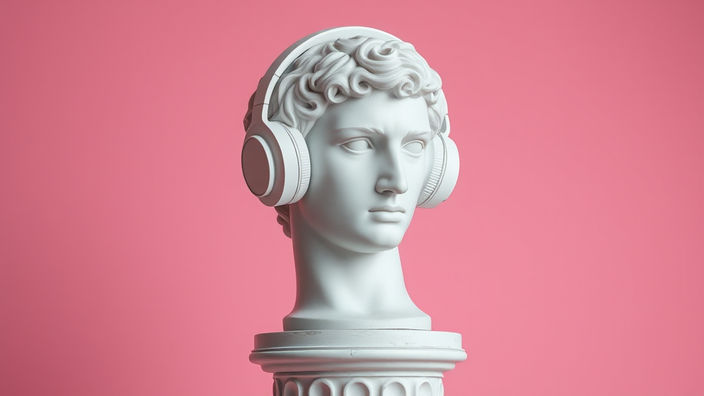 A marble bust of David adorned with sleek white over-ear headphones, resting atop a classical Doric column, set against a vibrant pastel pink backdrop, capturing a blend of classical and modern style elements.