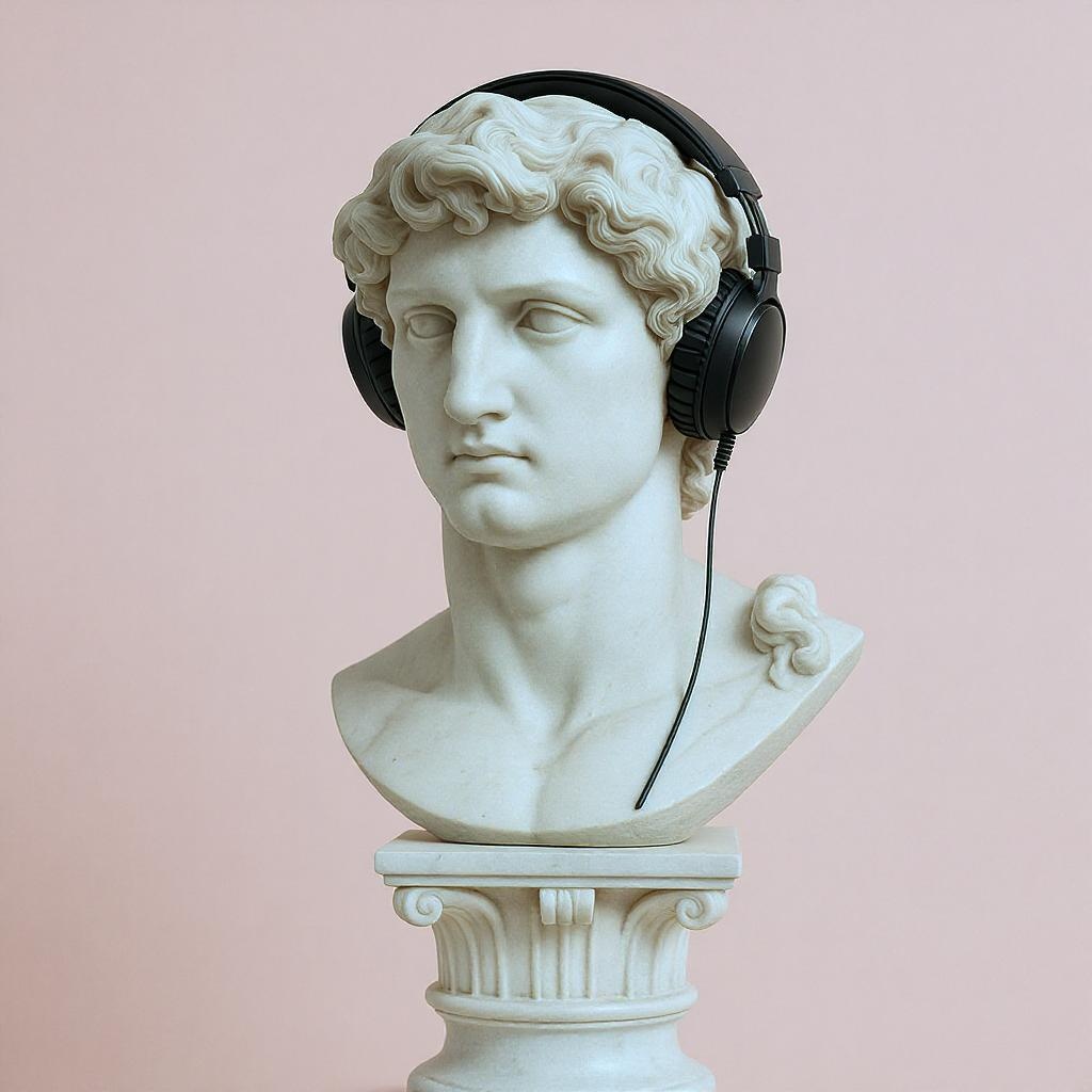 A marble bust of David wearing sleek black headphones, set atop a Doric column, with a pastel pink backdrop.