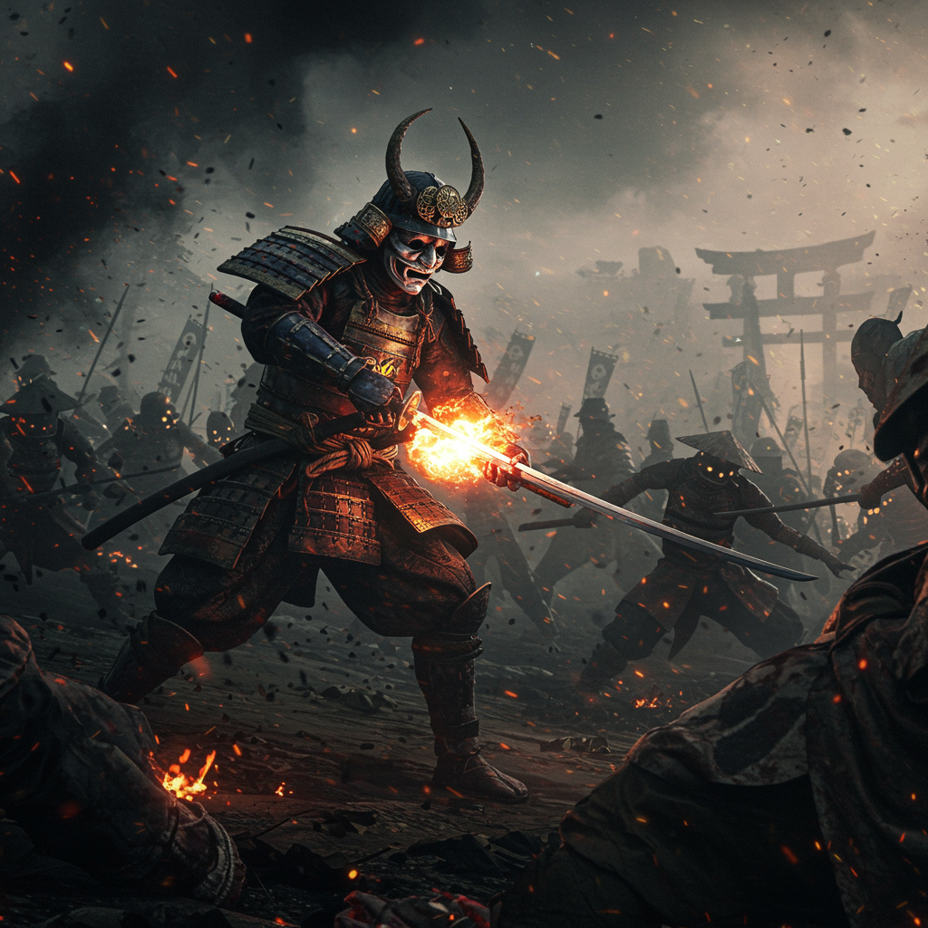 A masked divine samurai in action, wielding his mystical katana with blazing fury against foes in a fierce battle, adorned in full-body galaxy armor. Swirling plumes of jet-black smoke and charcoal envelop the scene, contrasted by vibrant bursts of color. Set against the chaotic Sengoku period backdrop, the scene is incredibly detailed, morbid, and dark, featuring key visuals reminiscent of the Renaissance. Volumetric light bathes the scene in an atmospheric glow, captured in a style blending Greg Rutkowski's and Peter Mohrbacher's influences. The hyper-realistic, ultra-wide epic shot, rendered in Unreal Engine 5, showcases the cinematic grandeur and intricate textures of the conflict, creating a breathtakingly immersive experience.
