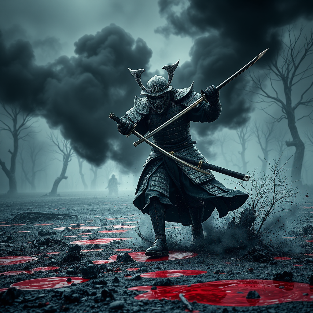 A masked mystical samurai charges through a grim battlefield, his mystical katana slicing through the chilling air as plumes of jet black smoke swirl around him. His star dusted full body armor glimmers under the eerie light, casting a haunting glow. Set in the Sengoku period, the scene is painted in dark, morbid tones with crimson red puddles reflecting the blood-soaked ground. Epic landscape details stretch into the horizon, with a renaissance touch adding texture and depth. Volumetric light filters through sparse, skeletal trees, enhancing the atmospheric winter setting. The composition captures a highly realistic, incredibly detailed scene with an ultra-wide epic shot, reminiscent of the styles of Greg Rutkowski and Marc Simonetti. A chaotic dance unfolds on this battlefield, the unreal engine's power crafting an award-winning visualization of tension, honor, and mysticism.