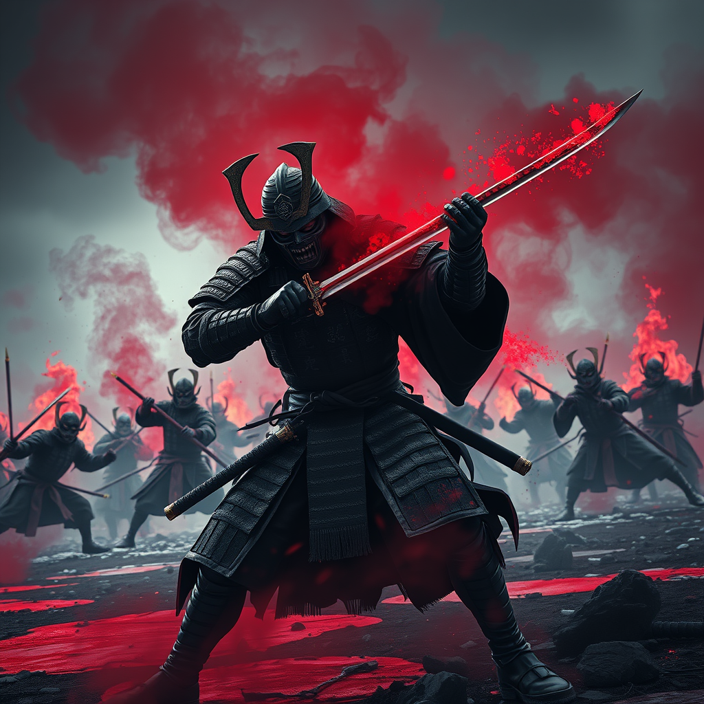 A masked mystical samurai engages in a fierce battle against enemies wielding a mystical katana, adorned in stardust-imbued full body armor. Plumes of crimson red smoke envelop the epic battleground, capturing the atmospheric essence of the Sengoku period. The scene is morbid and dark, with volumetric light filtering through an overcast winter sky, illuminating crimson red puddles scattered across the battlefield. The landscape is richly detailed, echoing renaissance artistry, reminiscent of works by Greg Rutkowski and Marc Simonetti. The ultra-wide epic shot, rendered in Unreal Engine 5, captures the intense, award-winning realism of the scene, blending key visuals with atmospheric tension in a digital art masterpiece.