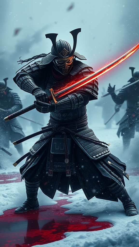 A masked mystical samurai engages in fierce battle against enemies, wielding a legendary katana that shimmers with otherworldly energy. His star-dusted full-body armor glistens under ethereal glows, while shadows of jet black smoke swirl around him. Set in the tumultuous Sengoku period, the battlefield unfolds in an epic winter landscape marked by its dark, morbid tones. Crimson red puddles seep into the snow, creating a striking contrast, as the scene is enveloped in volumetric light. The atmosphere is charged with tension, reminiscent of a dark renaissance. Captured in an ultra-wide shot with incredible detail, the composition is reminiscent of the styles of Greg Rutkowski and Marc Simonetti, resembling award-winning digital art created with the power of Unreal Engine 5.