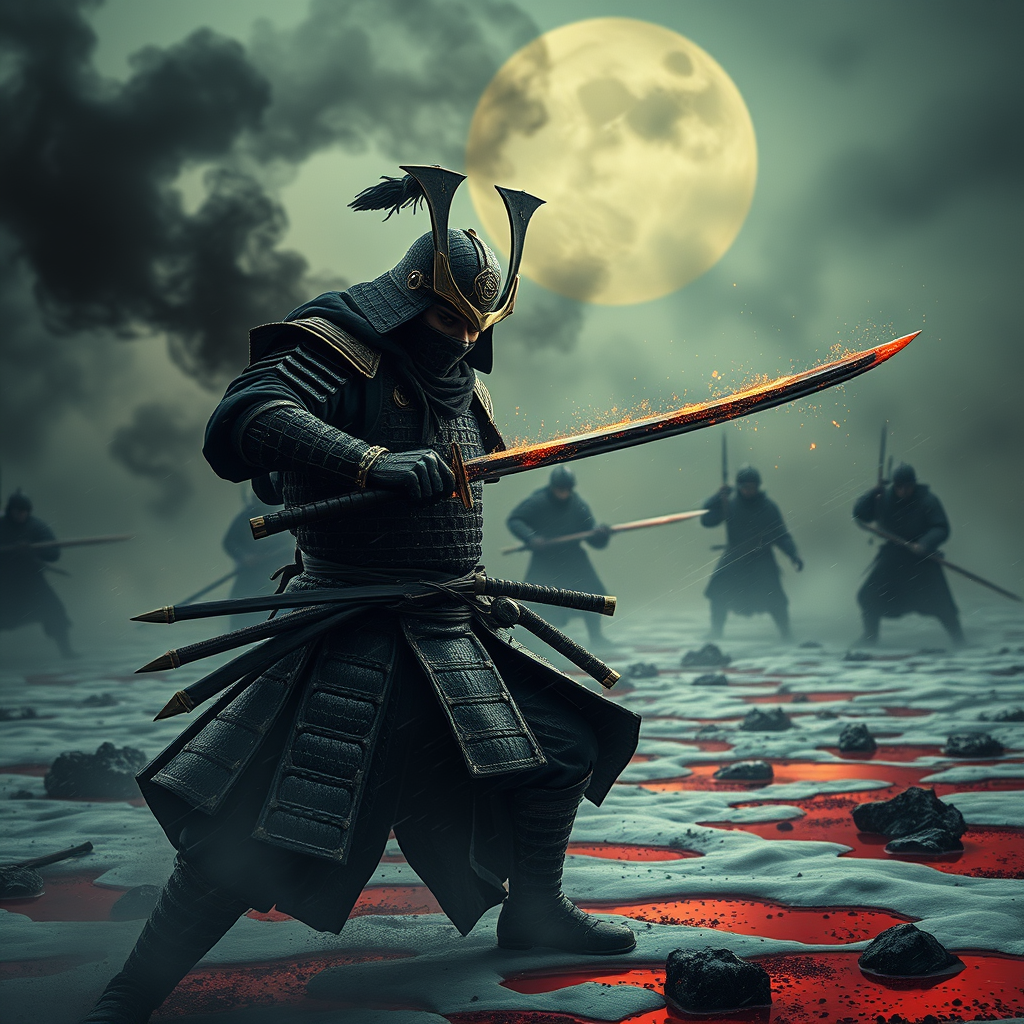 A masked mystical samurai fiercely engages his enemies with a mystical katana, set amidst a haunting battlefield. His armor glimmers with stardust, and dark plumes of smoke swirl around him. The epic landscape of the Sengoku period unfolds with morbid, dark nuances, enhanced by key visual elements inspired by renaissance art. Volumetric light cascades across the scene, casting a surreal glow over a winter battlefield dotted with crimson red puddles. The style pays homage to Greg Rutkowski and Marc Simonetti, showcasing incredibly detailed, photorealistic imagery. The composition, captured in an ultra-wide cinematic shot, is rendered with the advanced capabilities of Unreal Engine 5, creating an award-worthy digital art piece.