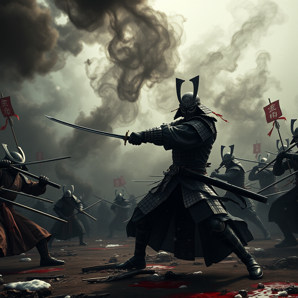 A masked mystical samurai fiercely engages his enemies with a mystical katana in a grim battle, donning star-dusted full body armor that reflects the ambient light. Plumes of swirling jet black smoke encircle him, set against an epic landscape filled with intricate details of the Sengoku period. The mood is dark and morbid, with key visuals reminiscent of a renaissance painting. Volumetric light casts dramatic shadows across the battlefield, creating an atmospheric scene. It's winter, and the ground is dotted with crimson red puddles, adding a somber tone to the brutal clash. The style blends the fantastical elements of Greg Rutkowski with the vivid imagination of Marc Simonetti. Incredibly detailed and highly realistic, this ultra-wide epic shot is a digital art masterpiece, crafted with the precision of Unreal Engine 5, capturing an award-winning view of the chaos and beauty of war.