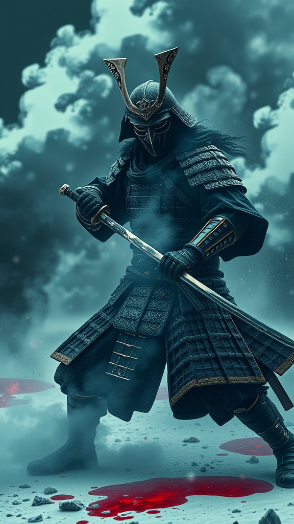 A masked mystical samurai, shrouded in mystique, wields an ethereal katana amidst a grim, violent clash against foes, his starry, full-body armor glowing with celestial dust. Jet-black plumes of smoke coil around him, painting an epic landscape set in the Sengoku period. The scene is morbidly dark and rich in key visuals, blending renaissance artistry with the menacing atmosphere of a battlefield. Volumetric light pierces through the icy winter air, illuminating crimson red puddles scattered across the ground. The style pays homage to artists like Greg Rutkowski and Marc Simonetti, bringing to life a highly realistic, intricately detailed, ultra-wide epic shot. This digital masterpiece, crafted with Unreal Engine 5, captures a breathtaking battlefield, worthy of accolades, where myth meets reality, portrayed in wide 16:9 proportions.