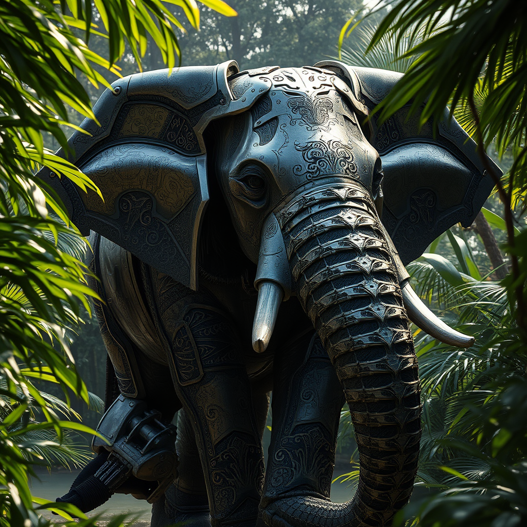 A massive cybernetic elephant clad in intricate battle armor stands majestically against the backdrop of a lush tropical forest, its metallic skin reflecting the interplay of light and shadow. The vibrant foliage frames the scene, highlighting the stark contrast between nature and machine. The chiaroscuro effect enhances the drama, accentuating the deep grooves and ornate patterns etched into the armor reminiscent of sgraffito art, while the air hums with the whirring of hidden machinery beneath the elephant's exterior.