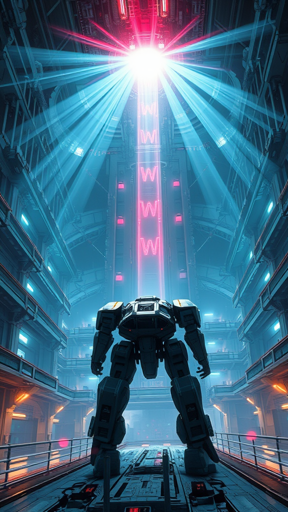 A massive humanoid mech navigating a colossal spaceship interior, reminiscent of Tsutomu Nihei's futuristic style, blending the grandeur of Sidonia no Kishi with architectural gigantism. The scene features a central laser generator emitting beams from above, bathing the multi-story space in pulsating energy clots. The setting, rich in science fiction elements, captures hyper-detailed anime graphics in super-resolution, showcasing vivid light flashes and the speed of acceleration. The mech, illustrated in a first-person perspective, maneuvers through this dynamic environment filled with rapid changes and technological marvels, depicted in an ultra-high definition 8K manga style.