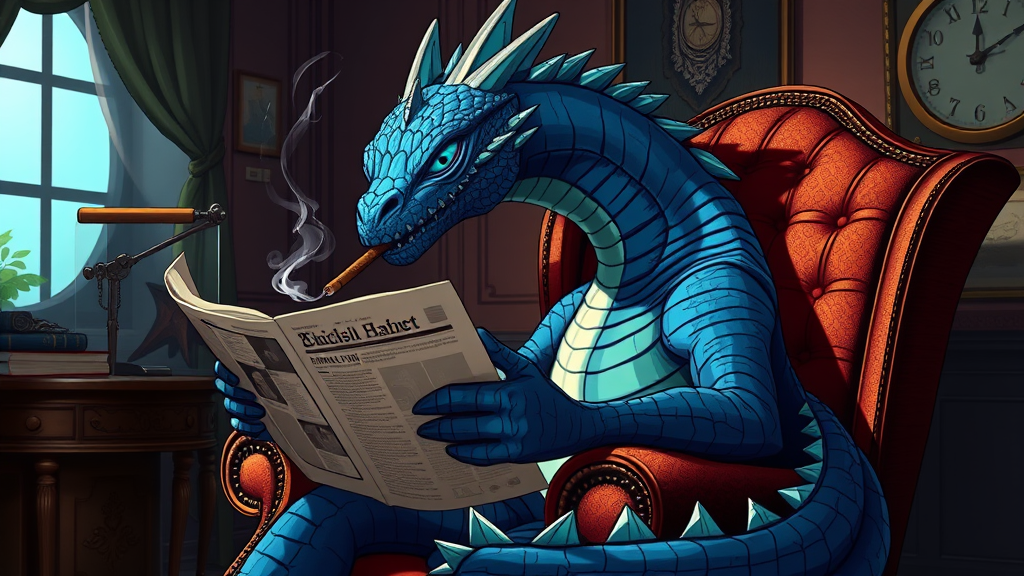 A massive indigo dragon with gentle cerulean eyes sits in a vintage armchair, smoke curling from a slim cigarillo in its mouth, while scanning a futuristic newspaper. Its back adorned with iridescent spikes, the scene is set in a retro-futuristic cartoon style, with dramatic cinematic lighting casting playful shadows around the room.