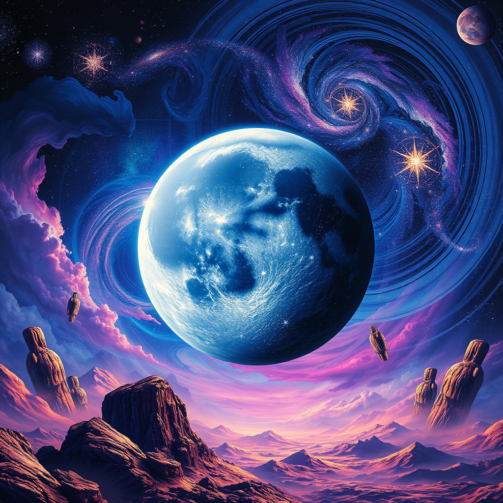 A massive moon colliding dramatically with the earth, set against a backdrop of swirling galaxies, features vibrant and surreal hues, dominated by intense blues and purples. The scene exudes a cosmic, otherworldly atmosphere, with an abstract and dreamlike quality permeating the visual landscape, blending the lines between reality and imagination.