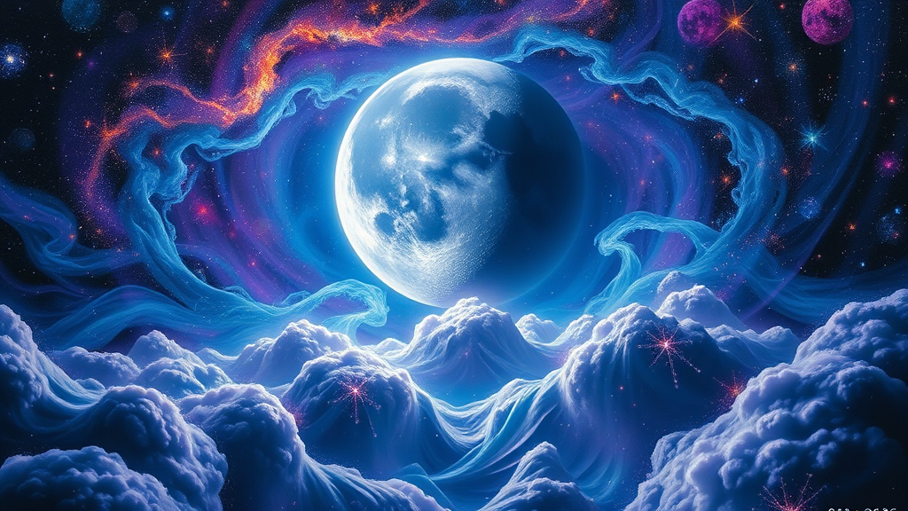 A massive moon descends majestically towards the earth, surrounded by swirling galaxies in a kaleidoscope of astonishing colors, dominated by vibrant blues and purples. The scene exudes a cosmic, otherworldly atmosphere that feels both ethereal and dreamlike. The abstract portrayal emphasizes the surreal interplay of celestial elements, inviting viewers into a visionary dreamscape.