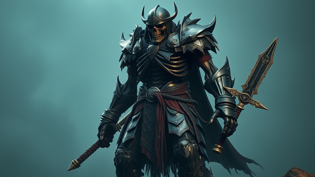 A massive Norse-inspired warrior looms, their towering figure encased in intricately detailed armor of dark bronze and deep crimson hues, exuding a crumpled, deconstructive appearance. The skeletal frame of the character is hauntingly lifelike, surrounded by dusty remnants that evoke a sense of gothcore and dark fantasy. The expertly crafted design by Antonio J. Manzanedo comes alive, showcasing hyper-realistic elements and unparalleled detail. Their twin swords gleam with an aura that hints at otherworldly dimensions, as ultra-realistic lighting highlights every facet of their presence in the scene, capturing a full-length perspective that immerses the viewer in this eerie yet captivating world.