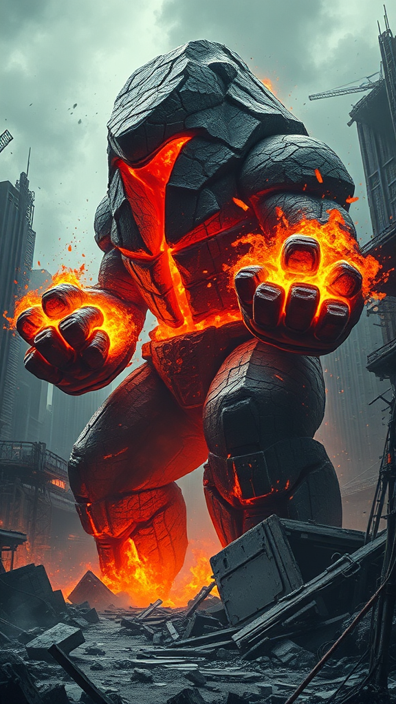 A massive primordial living lava golem towers amidst a ravaged futuristic urban landscape, its molten interior visibly churning behind a cracked rocky surface that glows with fiery intensity. In the midst of a ferocious martial onslaught, its blazing fists slam into the ground, sending shockwaves through the crumbling cityscape. Trailing thick, choking fumes, each movement melts steel structures and ignites debris in its path. The air shimmers with heat, distorting the view of melted glass and twisted metal as the golem relentlessly advances, embodying the destructive force of raw nature against the remnants of a high-tech world.