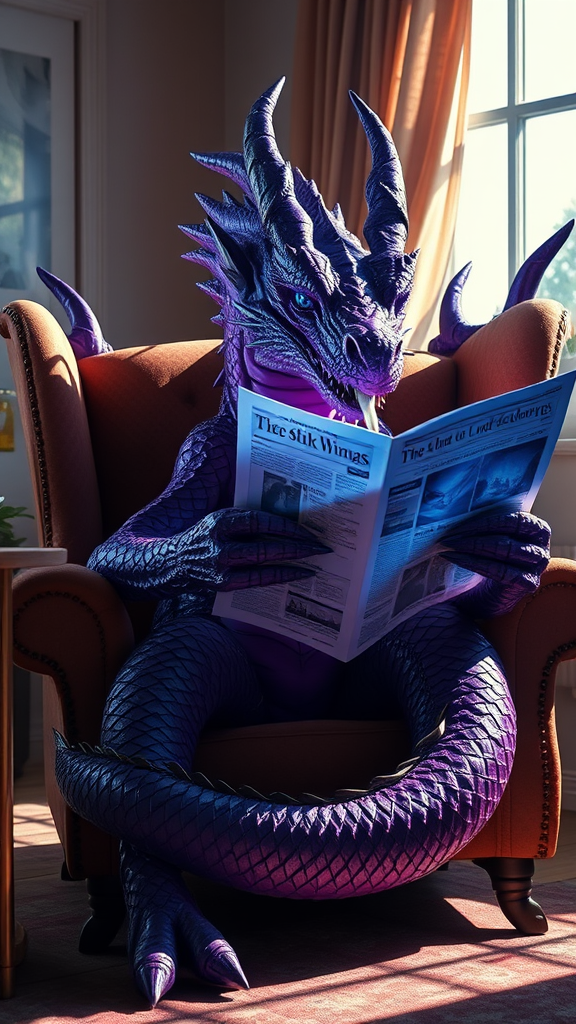 A massive purple dragon with wicked elegance, featuring large, kind, sapphire eyes, sits comfortably in a retro-style armchair. Its back adorned with menacing spikes, while a smoldering cigarette dangles from its lips. In its claws, a holographic newspaper unfolds, bathing the scene in a futuristic glow, cinematic lighting casting long shadows across the room as the dragon's blue eyes scan the headlines, retaining an air of peculiar charm.