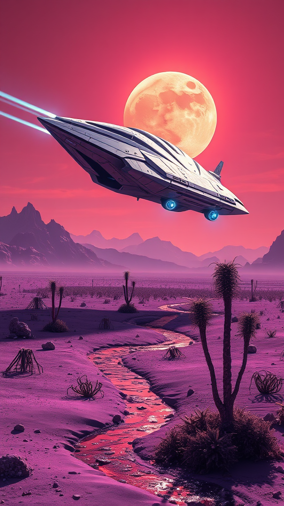 A massive, sleek spaceship descends onto an alien planet, its metallic surface glinting under the harsh, contrasting light of a distant sun. The ship's aerodynamic design features intricate panels and glowing engines that leave trails of blue luminescence in the thin atmosphere. Below, the alien landscape unfolds with jagged mountains silhouetted against a vivid orange and pink sky, and vast fields of crystalline structures that catch and refract the sunlight. As the spaceship touches down, its landing gear sinks slightly into the soft, violet-hued sands of the planet's surface, sending up gentle clouds of glittering particles. Strange, towering plants with bioluminescent vines sway in a light breeze, casting shifting shadows across the ground. Nearby, a small river of liquid metal winds through the landscape, reflecting the spaceship's image like a shattered mirror, emphasizing the blending of advanced technology and otherworldly beauty.