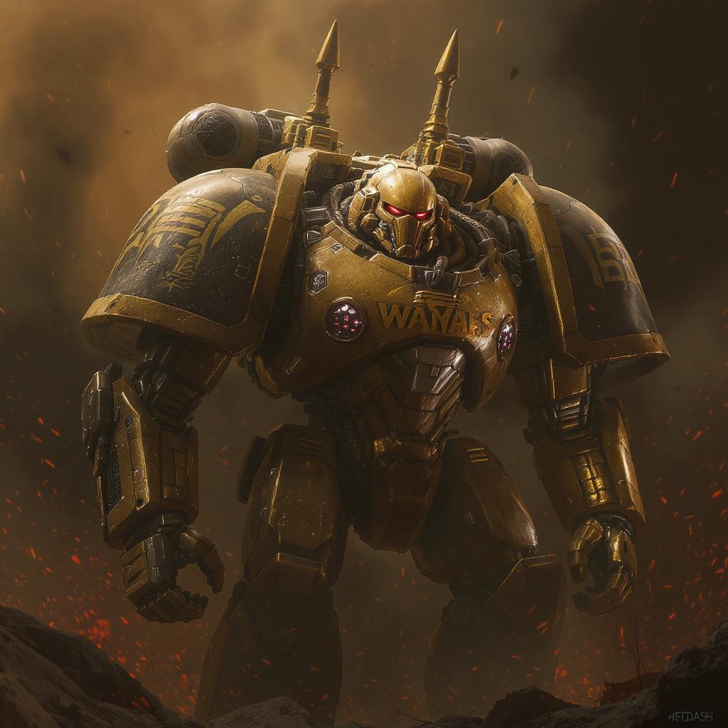 A masterful depiction of a heavily-armored combat robot, inspired by Warhammer 40,000 aesthetics, featuring intricate details and a golden color scheme. This epic and realistic artwork showcases a hyperdetailed robot amidst a complex, faded background, bathed in warm, dramatic cinematic lighting. The scene is imbued with HDR quality, capturing the essence of a futuristic battlefield where the robot stands as a formidable presence, exuding power and precision.
