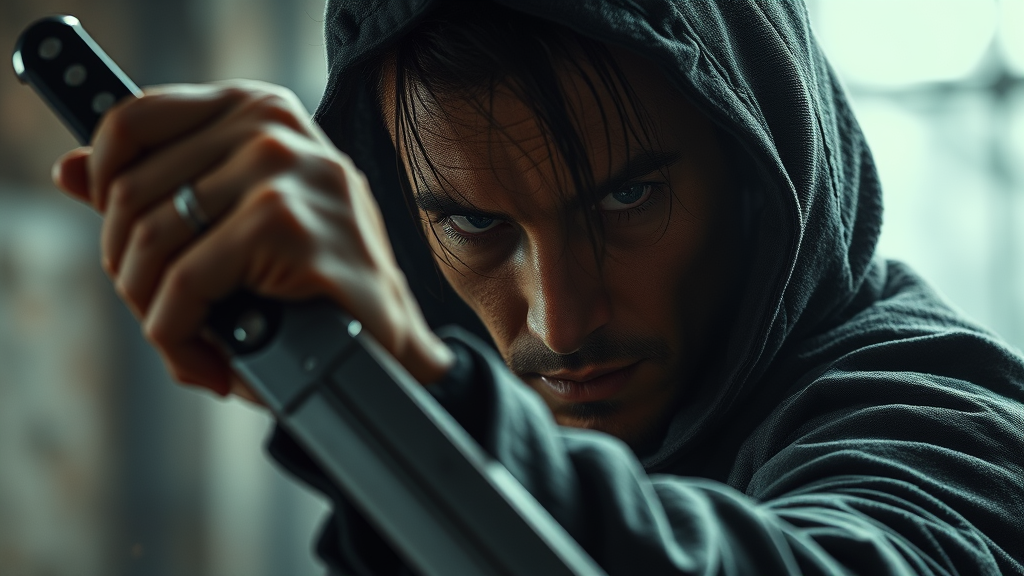 A masterful portrayal of a male assassin, expertly wielding a knife, with intricate details reminiscent of Rutkowski's style; the scene is cinematic, capturing the tension with a shallow depth of field, enhanced by Lightroom's lighting effects.