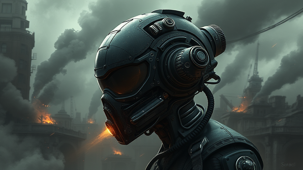 A masterfully crafted headpiece with a streamlined design in the style of Kou Yokoyama, embodying a dieselpunk aesthetic. This concept art features intense combat action set against the backdrop of a ruined city, exhibiting a retro-futuristic theme. The artwork showcases intricate mechanisms and a wealth of details, with vintage elements and billowing smoke enhancing the dramatic background. The color palette is dominated by dark hues and a somber gray atmosphere to achieve a realistic digital painting. The headpiece is portrayed in a three-quarter view, illuminated by multiple light sources that add depth and cinematic flair. Natural textures and reflections on the surface accentuate the use of authentic materials. The scene evokes a strikingly detailed illustration with subtle cinematic lighting, while maintaining a sense of natural realism that enhances the overall composition.