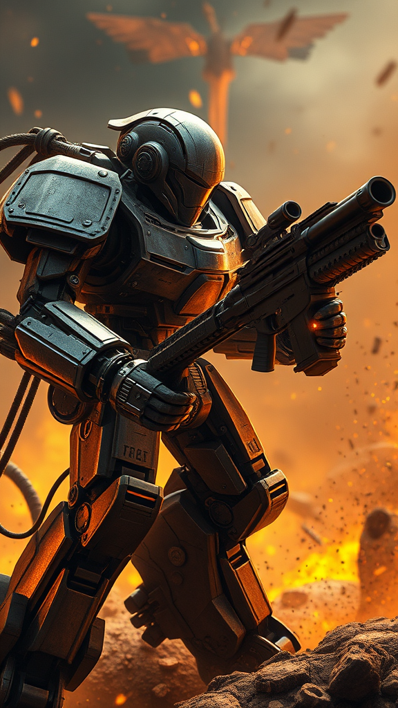 A masterfully crafted robot engages in combat against a heavily armed adversary, rendered with exceptional detail. The scene exudes golden hues reminiscent of Warhammer 40,000, embracing an epic and realistic style. The composition is hyperdetailed, featuring a complex background bathed in warm, dramatic lighting that adds a cinematic quality to the scene. Subtle faded elements enhance the overall artistic impact, creating a breathtaking and immersive masterpiece.
