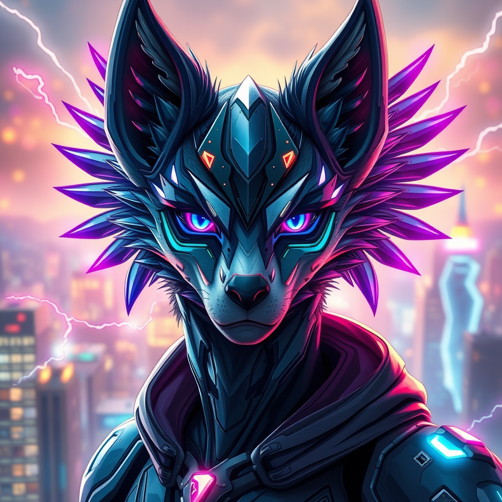 A masterfully drawn, dramatic cyberpunk portrait of a gay male protogen fursona with thunderbird lightning wings. Featuring a SciFi background adorned with mecha elements and vivid bokeh effects. The headshot is rendered in sharp focus with cinematic lighting and vibrant glow effects, showcasing vivid colors in UHD 16k resolution with HDR10 quality. The character, inspired by Lyriel v. 1.5, displays an intense gaze, merging organic and technological aesthetics. The scene is set against an expansive cityscape, hinting at futuristic innovation and conveying an electrifying, otherworldly atmosphere.