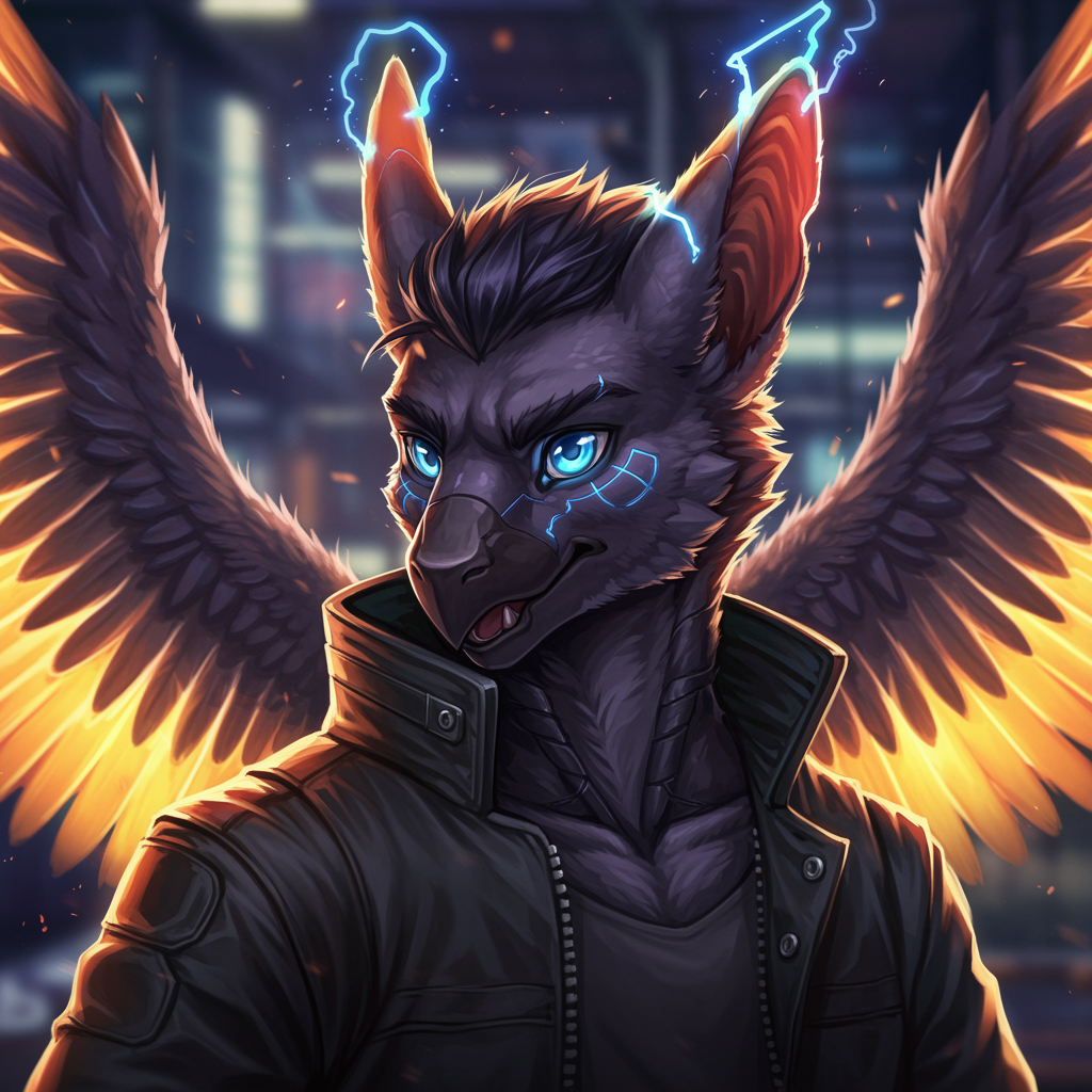 A masterfully drawn gay male protogen fursona, depicting a thunderbird with lightning-charged wings, features a cyberpunk-inspired headshot. The character is rendered with dramatic and cinematic lighting that highlights intricate glow effects. Set against a sci-fi backdrop, the image combines elements of mecha and sharp focus, with a bokeh effect enhancing the composition. Vivid colors bring the scene to life in ultra-high-definition 16k resolution with HDR10 quality and absurdres detail. The personality and essence remain true to the concept while allowing for small creative deviations.