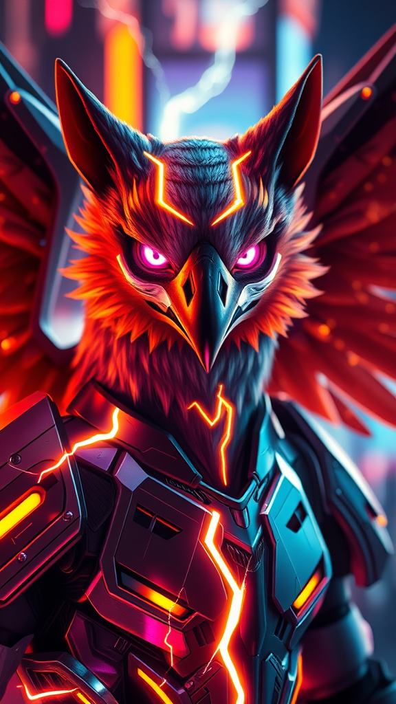 A masterfully drawn gay male protogen fursona, embodying the majestic essence of a thunderbird with electrifying lightning wings, portrayed in a dynamic cyberpunk headshot. The composition showcases dramatic and cinematic lighting, enhanced by captivating glow effects. Set against a vibrant sci-fi background, the scene is enriched with mecha elements, maintaining sharp focus and exquisite bokeh. Vivid colors saturate the image, presented in stunning 16k resolution with UHD and HDR10 quality, capturing absurd levels of detail. The modified design, inspired by Model: Lyriel v. 1.5, retains the core concept while introducing subtle creative touches, elevating it to an extraordinary realm of visual storytelling.