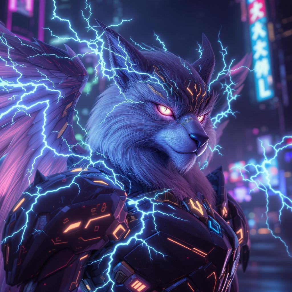 A masterfully drawn, vividly creative depiction of a gay male protogen fursona, featuring a thunderbird with dynamic lightning wings set against a cyberpunk backdrop. The headshot captures dramatic and cinematic lighting, with striking glow effects highlighting the intricate mecha details. Sharp focus and a vibrant sci-fi background enhance the scene, with an artful bokeh adding depth. The piece is rich in vivid colors, presented in 16k resolution with UHD and HDR10 quality for absurdly high detail.